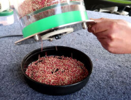 2. Achieve the target weight by running seed through the metering system for 60 seconds, collecting all the seeds leaving the system in the hopper lid. Weigh the total seed collected. Adjust the seeding rate on the electronic control unit and repeat until the target weight is achieved. Once the target weight is achieved, record the seeding rate so when sowing that type of seed in the future, all you need to do is enter the appropriate setting.